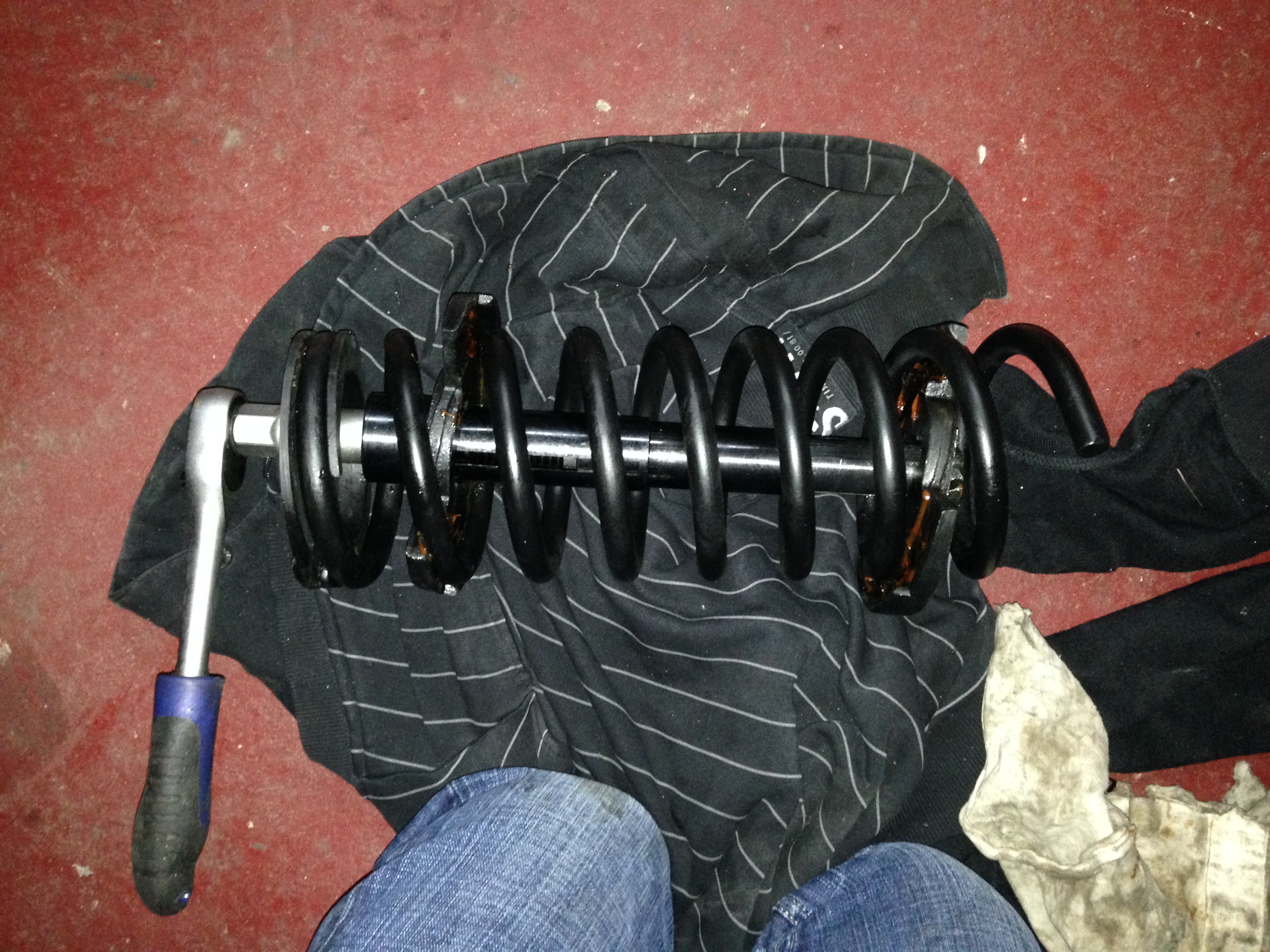 Es gibt eine obere und untere Platte, die ich ein wenig gefettet habe um Kratzer zu vermeiden. Darf nicht mit einem Schlagschrauber montiert werden also Ratsche genommen. Ein wenig mehr habe ich dann noch spannen müssen. Und er steht wieder ohne Krücken aber auf den falschen Schuhen.