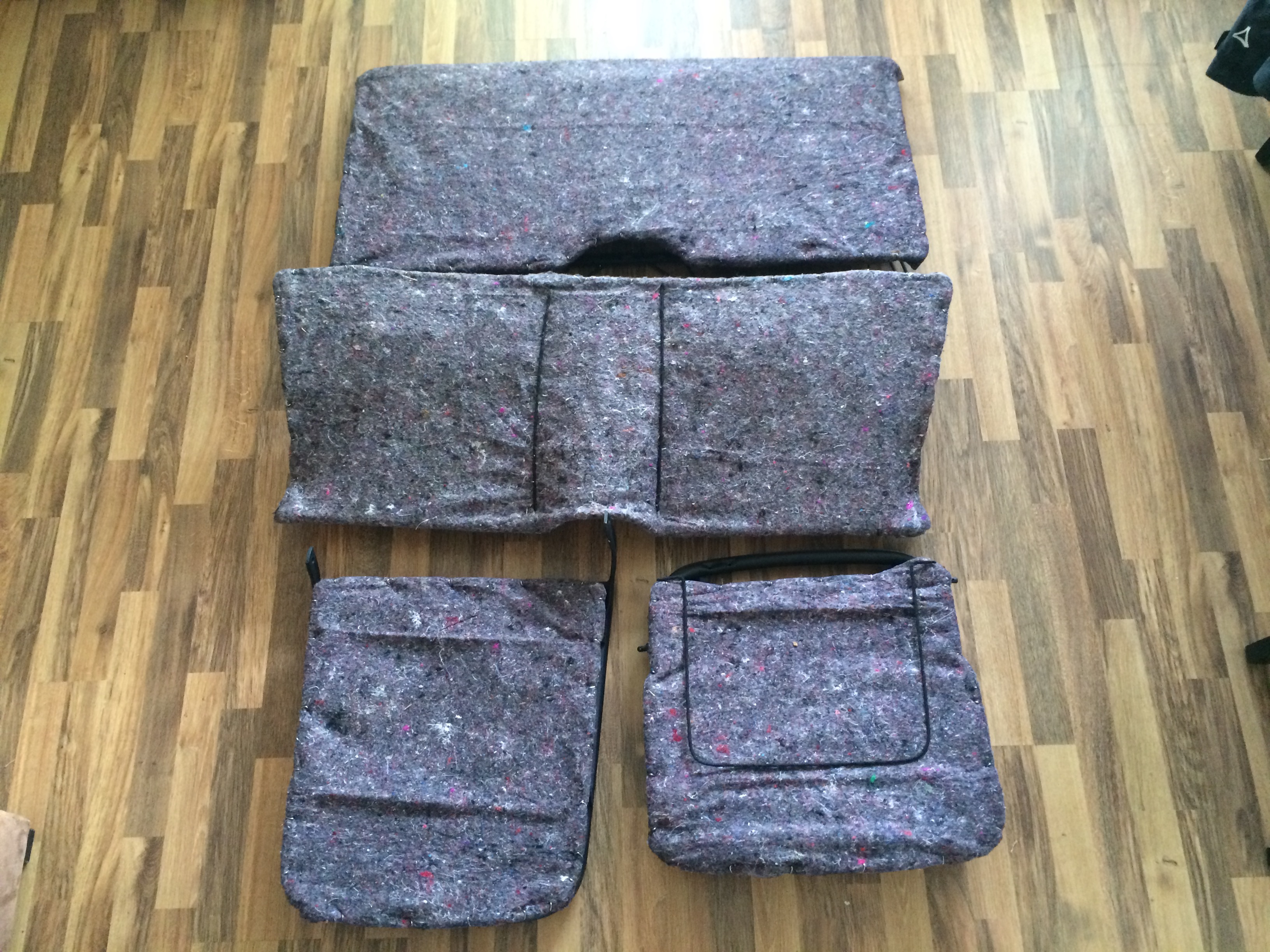 Beim Rückenteil ist die Anwendung vom Prinzip genau so. Dachte erst ich könnte das Baumwollflies einfach um das Gestell rumliegen, aber das funktioniert natürlich nicht, da dann nicht mehr genug Platz für den Überzug ist. Also in Größe der Oberfläche der Rückbank zurechtschneiden und die ganzen Reste (da bleibt einiges übrig), nach dem befestigen mit den Hogrings satt unter die Federung in alle Ecken stopfen, so dass sich von außen alles schön prall anfühlt und nicht eingedrückt werden kann.