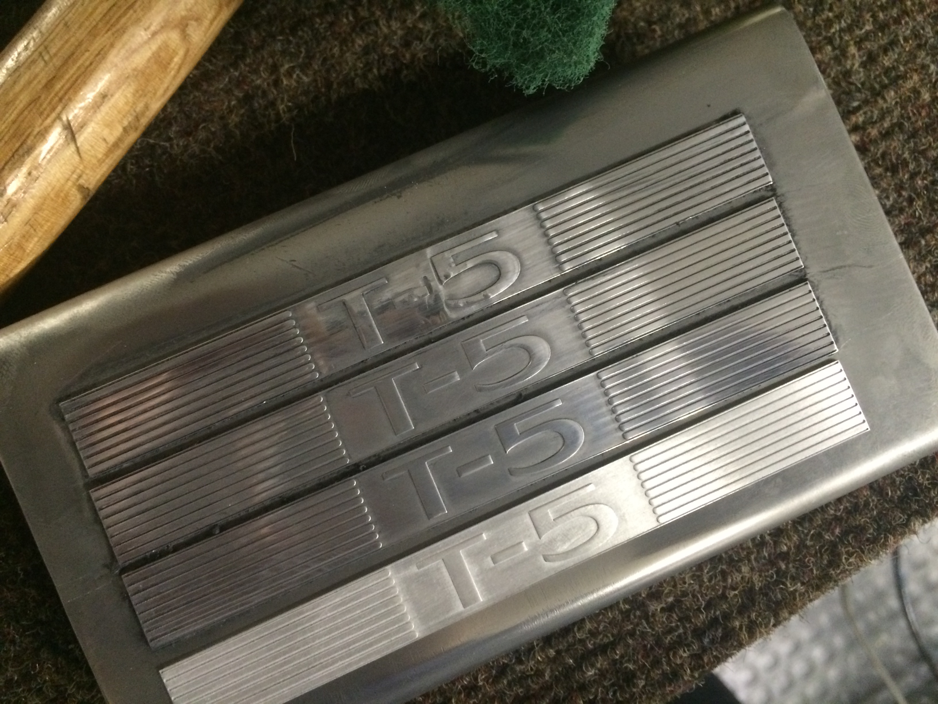 Zunächst musste ich das original T5 Emblem vermessen und scannen. Davon habe ich eine 2D Datei mit Illustrator erzeugt und versucht die Einleger mit einem Laser auf Blech zu gravieren. (oben das Teil) Das Ergebnis war jedoch nicht zufriedenstellend und dann habe ich in Soldworks eine 3D Datei modeliert. Davon hat mir Jens mit seinem 3D Drucker Muster gemacht aber auch das war noch nicht das was ich wollte. Also weiter nach mechanischen Bearbeitern gesucht, die sehr feine Fräser haben. Auch hier hatte ich Rückschläge hinzunehmen da z.B. doppelt so große Teile geliefert wurden