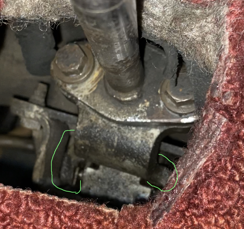 Der Bügel ist da, nur auf dem anderen Bild schlecht zu erkennen, hier sieht man den ein wenig besser: Das 69er Getriebe hat halt den Tachowellenausgang auf der anderen Seite, und man muss die Handbremse anders verlegen.