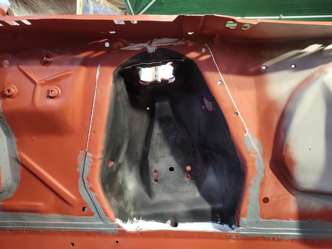 Was jetzt wenigsten fertig ist, aber auch nicht ganz wie erhofft geworden ist: Der Motorraum ist lackiert. Allerdings muss ich mir vermutlich von den Lackierern hier jetzt was anhören. Eigentlich wollte ich nur ausbessern, dann ist es Stück für Stück mehr geworden und am Ende Frage ich mich wieder warum ich mir nicht wenigstens von einem Profi Rat geholt habe :?