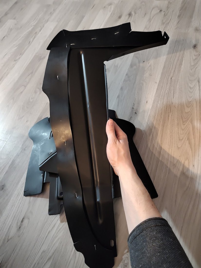 Spritzschutzbleche hatten den bekannten Lackaufbau (1K schwarz, 2K Klarlack) bekommen, jedoch in dem Fall mit 1K EP Primer. Die Tackerklammern die bei den Gummilippen dabei waren waren der größte Witz. Ein Abend vor dem Fernseher hat es mich gekostet aus Edelstahldraht 1mm eigene Klammer zu biegen und zu montieren. Die Löcher im Blech selbst waren ja schon drin.
