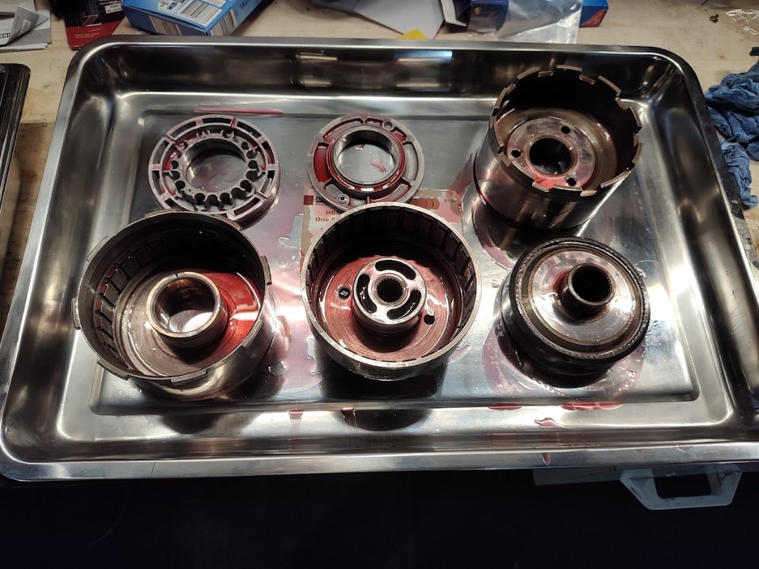 In den letzten Posts zum Getriebe hatte ich die Probleme ja schon gefunden. Ein unpassender Valvebody und allgemein viel Verschmutzung waren die Probleme. Daher war eigentlich hauptsächlich putzen angesagt, Waschtisch und Ultraschall bewirken hier echt Wunder, und den korrekten Valvebody verbauen (Danke nochmal an Theo). Die entsprechenden Modifikationen am Schaltgestänge waren einfach zu erledigen. Mein neuen Valvebody konnte ich nach dem Korrosions-Zwischenfall noch retten. Alle Ventile ließen sich nach dem WD40-Bad demontieren und liefen nach einer Politur bzw. Beseitigung der Korrosionsrückstände einwandfrei. In dem Zuge hat auch ein Transgo 40-2 Einzug gehalten.