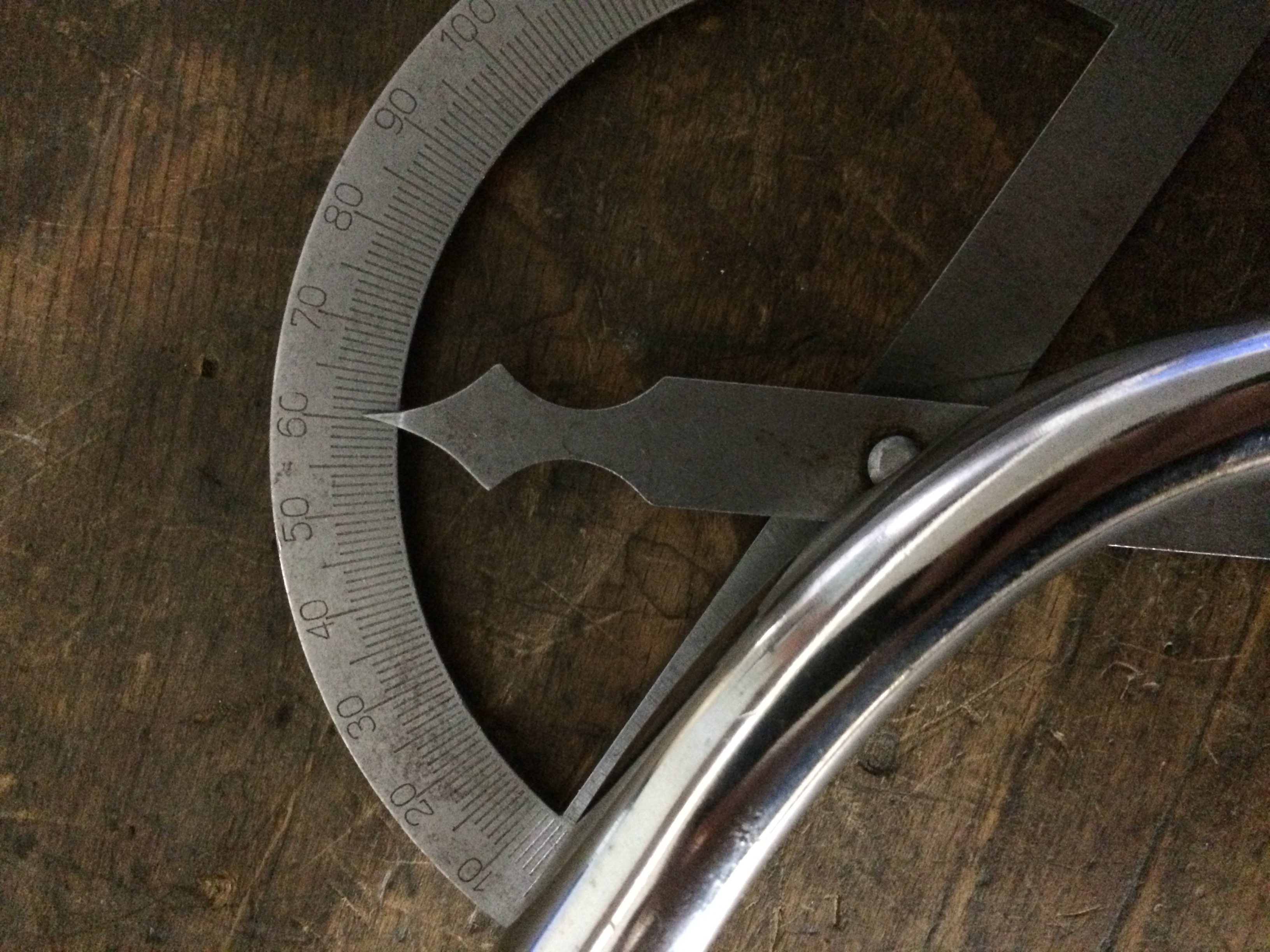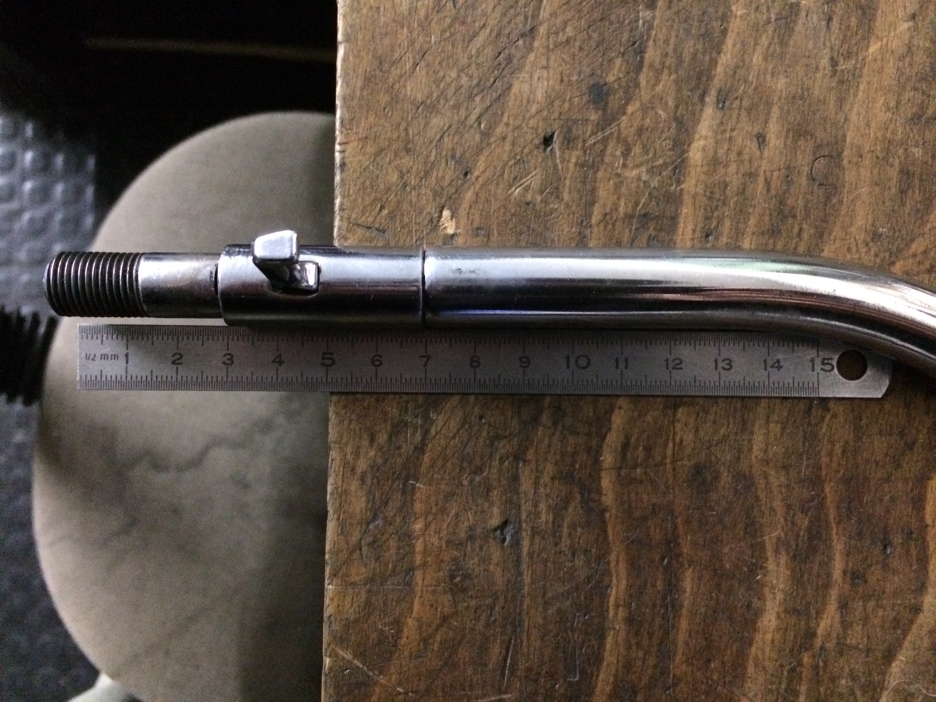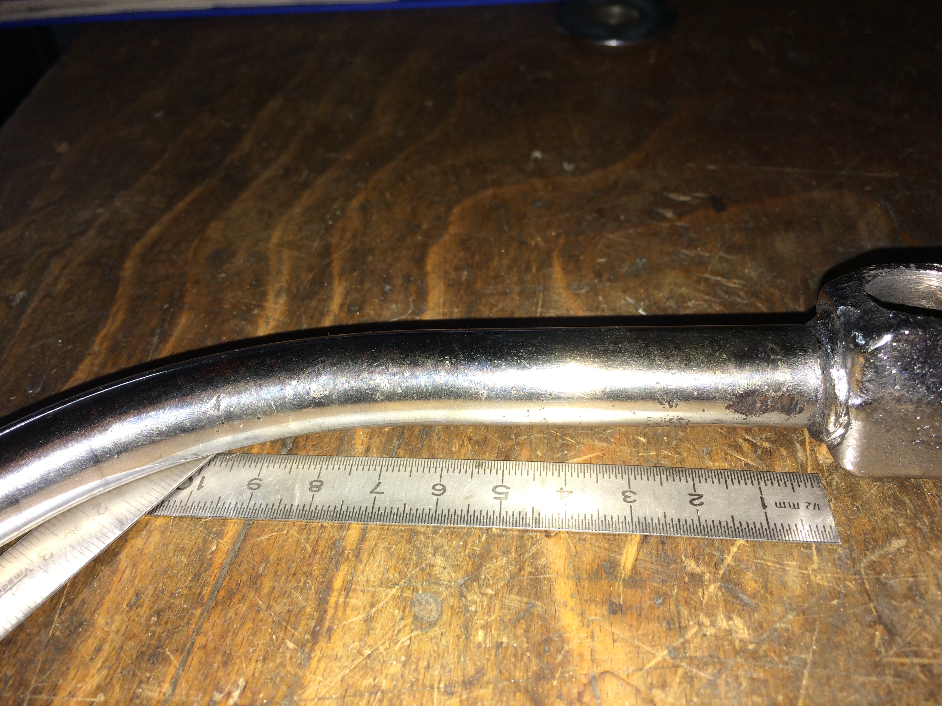 Kannst du mir bitte die Maße nehmen? Druchmesser der Stange, ganze Länge, Längen der geraden Stücke oder der Biegung und zuletzt den Winkel? (An Bildern hab ich etwa 55° gemessen)