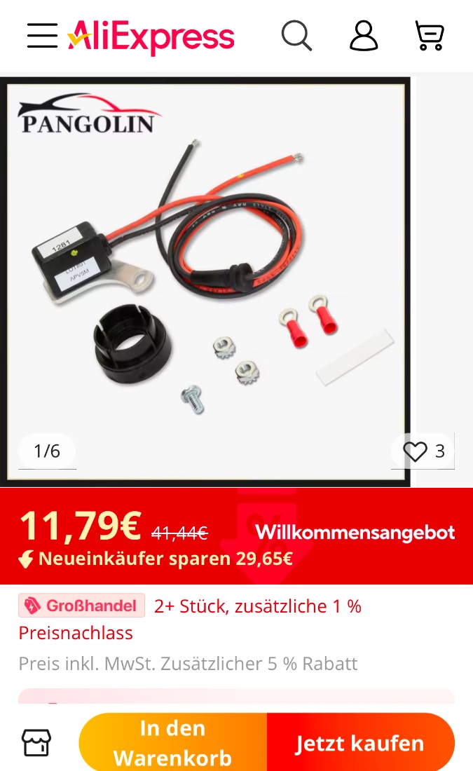 Kalle hat geschrieben: Mo 23. Dez 2024, 17:49 Es gibt ja noch einen Pertronix Verschnitt mit anderem etwas kantigem Gehäuse, die 1:1 Kopie scheint ja erst kürzlich im Umlauf zu sein. Hab ich mir auch mal zum Testen bestellt, 11,20 € inkl. Versand auf Aliexpress. Wollte mir eh eine Ersatz Pertronix in den Kofferraum legen, für den Fall der Fälle.