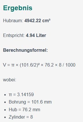Mit 101mm Bohrung statt 101,2mm und 76,2mm Hub kommt man ungefähr auf die korrekte Zahl. GGf. war es auch nur ein Umrechnungs- oder Rundungsfehler von inch in mm.