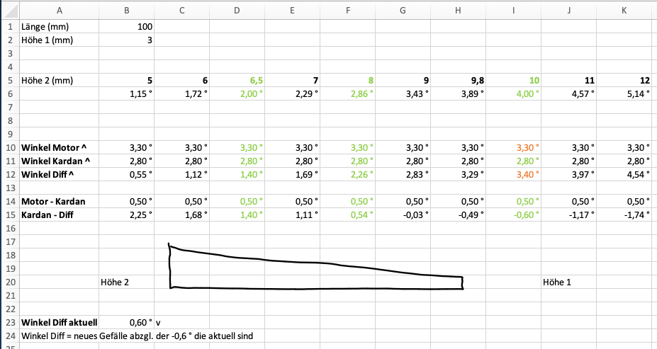 Ausgehend vom aktuellen Diff mit -0,60° würden dann die entsprechenden Werte in Zeile 15 rauskommen (ja, auch die Zeile 14 wird sich wohl etwas ändern, wenn sich die Steigung vom Diff ändert)