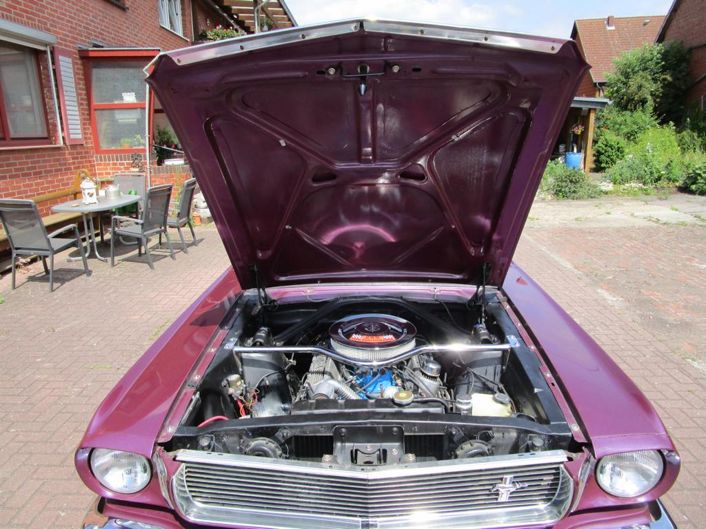 Dieses schöne 66er Coupe kauften wir von Louden Holiday und Virginia Lou aus Oregon. Der Mustang wurde am 20sten September 1965 in San Jose gebaut und derzeit auch im selben kalifornischen Distrikt verkauft. Irgendwann wanderte er dann die Westküste hoch nach Oregon. Der Unterboden ist ungeschweißt. Der Wagen wurde dort im Jahr 2000 aufwändig restauriert. Die Besitzer scheuten keine Mühen und Ausgaben. Das Pony wurde für amerikanische Verhältnisse außerordentlich gut und teuer lackiert. Alle Karosseriedichtungen wurden erneuert. Eine neue Windschutzscheibe wurde montiert. Alle Fensterantriebe wurden überholt. Laut den Besitzern soll für den Lack der Farbton „Plum Crazy“ aus dem Mopar Tuschkasten ausgewählt worden sein. Zusätzlich wurde der perfekt lackierte Wagen mit typisch amerikanischem Pin-Striping verziert. Auch dies wurde vom Profi ausgeführt. Desweiteren wurde das komplette Interiour erneuert. Teppich, Himmel, Türverkleidungen, Sitzbezüge, Armaturenbrett. Ein überholter 289er wurde eingesetzt , sowie ein überholtes C4 Automatikgetriebe. Coole Sportfelgen wurden gekauft. Eine Doppelrohranlage für den kernigen V8 Sound montiert. Alle Firmen die am Mustang mitgewirkt haben, sind in einem Bilderrahmen mit ihren Business Cards verewigt worden. Aktuell wurden hier gerade noch mal 2000 Euro für die deutsche Zulassung investiert. Der übliche bürokratische Papierkram. Die unteren Querlenker kamen komplett neu. Der Umlenkhebel der Lenkung (Idler Arm). Bremsschläuche, Zündkabel und Verteilerkappe, Scheinwerfer und Warnblinkanlage. Motoröl und Filter. Etc. Etc. Der Mustang läuft und fährt super. Tüv und H-Zulassung sind neu. Preis VB: 23900 EURO. Update: Gerade wurde noch ein nagelneuer Edelbrock 4fach Vergaser montiert. Andere Räder wären eventuell auch möglich. Zum Beispiel ein Satz American Racin Tourque Trust D.